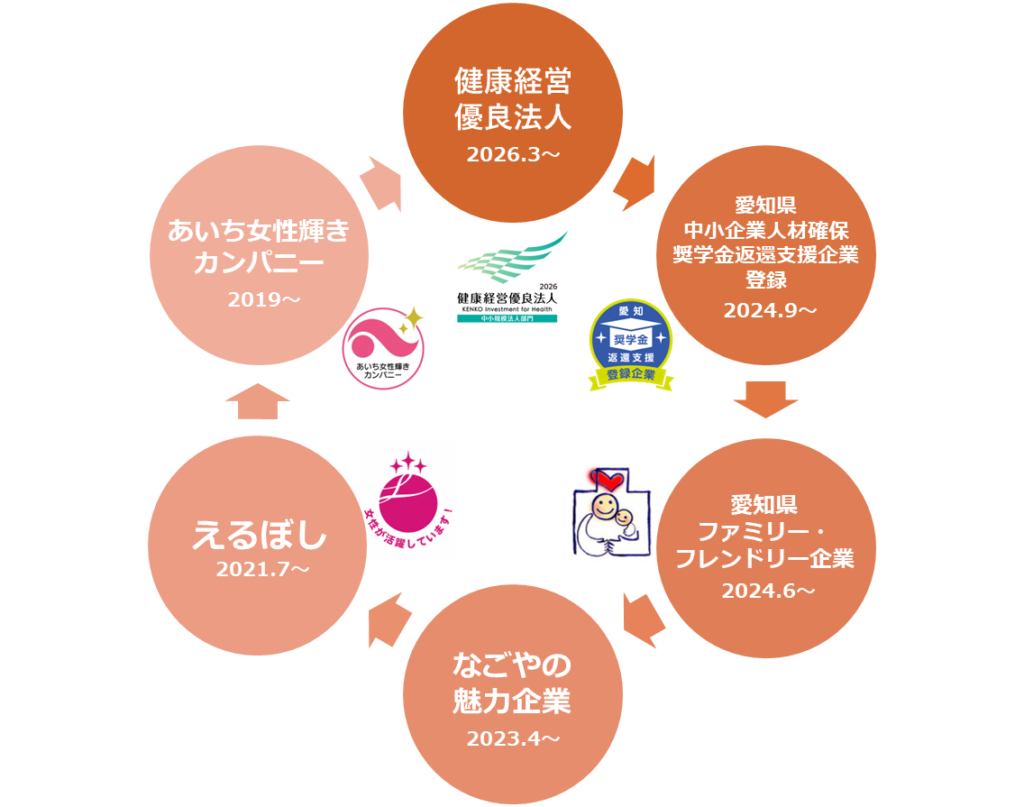 時間単位の有給休暇取得、年次有給休暇の計画付与制度化など、私生活と仕事を両立しながら働くためにサポートをしています。また、えるぼし(基準適合一般事業主)認定をはじめ、子育て応援のファミリー・フレンドリー企業の認定、愛知県中小企業人材確保奨学金返還支援企業の登録など、働く環境の改善に取り組んでいます。